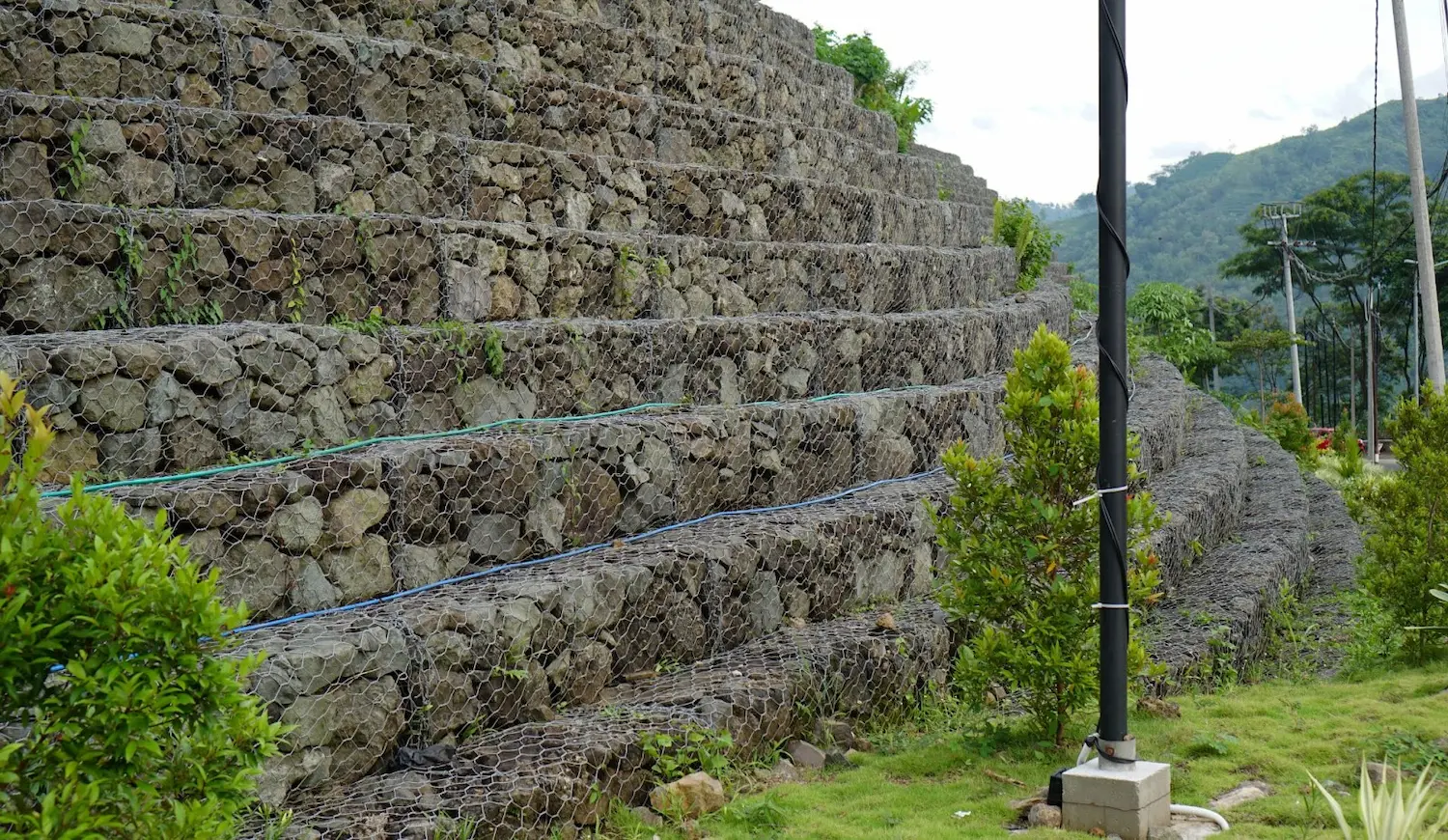 Sur l'île, les intempéries avec vent et fortes pluies sont fréquentes. Il est donc nécessaire d'installer une structure de support capable de retenir la terre, tout en lui permettant de se déplacer. Le mur de soutien en gabions est une solution idéale, car il est conçu pour laisser l'eau s'écouler entre les pierres. Cela permet au mur de résister aux intempéries, tout en se déplaçant légèrement selon les mouvements du sol.